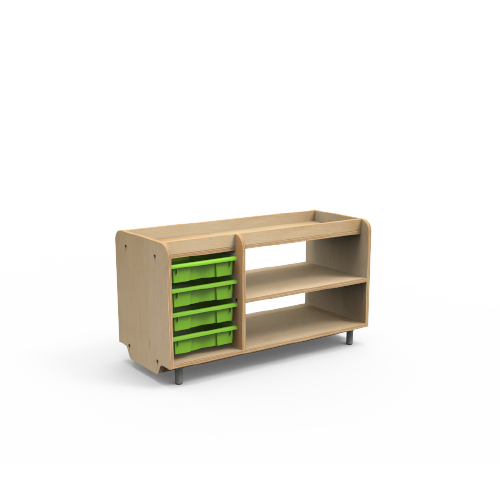 Compact footprint with integrated tote or open storage; durable worktop.