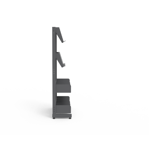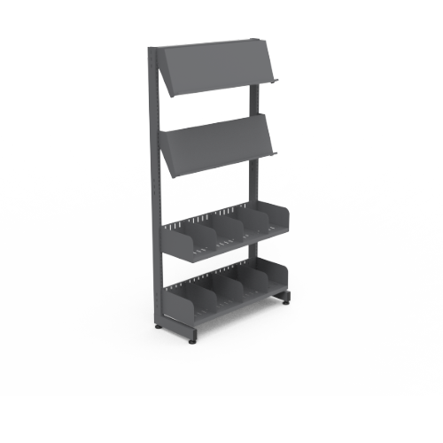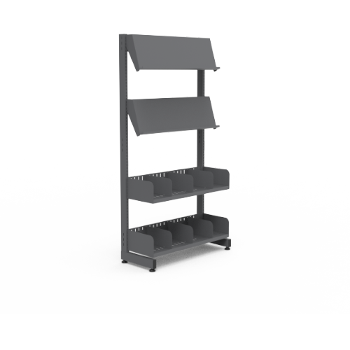 Single-sided shelving with angled magazine display.
